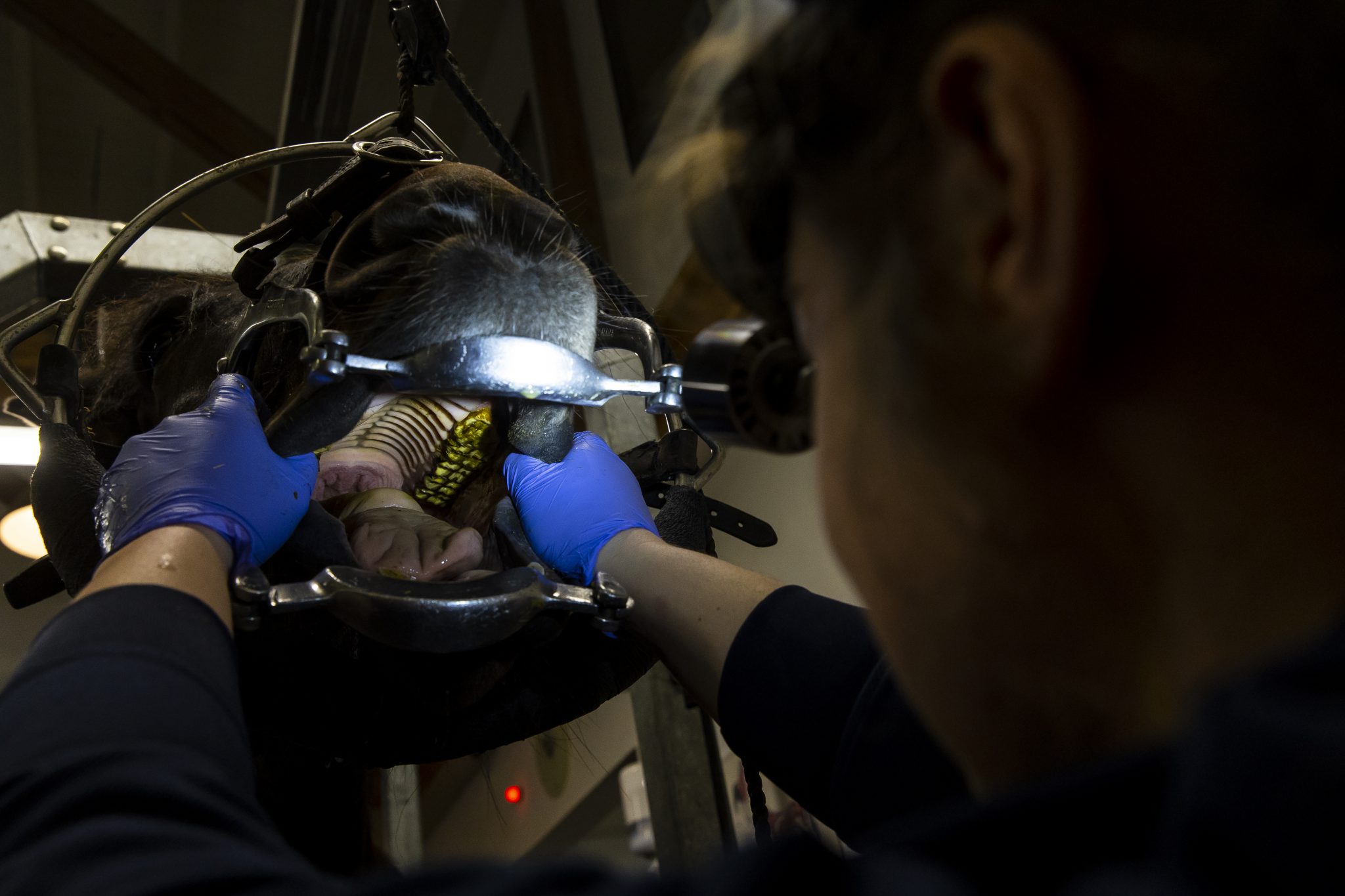 Het is mogelijk om bij u aan huis het gebit van uw paard, pony of ezel te onderzoeken en te behandelen. Hiervoor wordt de apparatuur meegenomen en hebben we enkel ruimte, water en stroom nodig. Daarnaast is het belangrijk dat er een mogelijkheid is om het hoofd van het paard in een speciaal halster omhoog te hangen aan bijvoorbeeld de rails van de stal, een balk boven de poetsplaats of eventueel door een ring in het plafond.